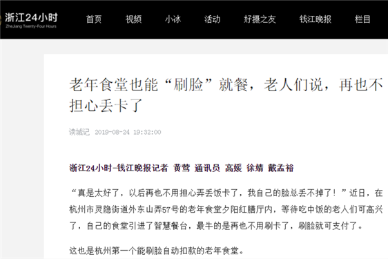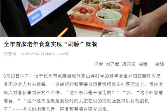 杭州首家老年食堂實現(xiàn)“刷臉”就餐吸引了多家媒體的目光,受到西湖傳媒、錢江晚報等多個媒體相繼報道。